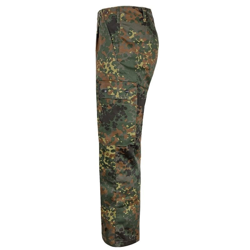 Le pantalon camouflage MIL-TEC BW Flecktarn est un pantalon avec deux poches italienne, deux poches cargo avec boutons à pression, une poche supplémentaire et une poche arrière avec rabat et bouton. Si besoin, vous pourrez y fixer des bretelles à boutons.